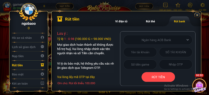 • Bước 5: Vào game, xác minh số điện thoại để rút nạp tiền và bảo mật tài khoản
