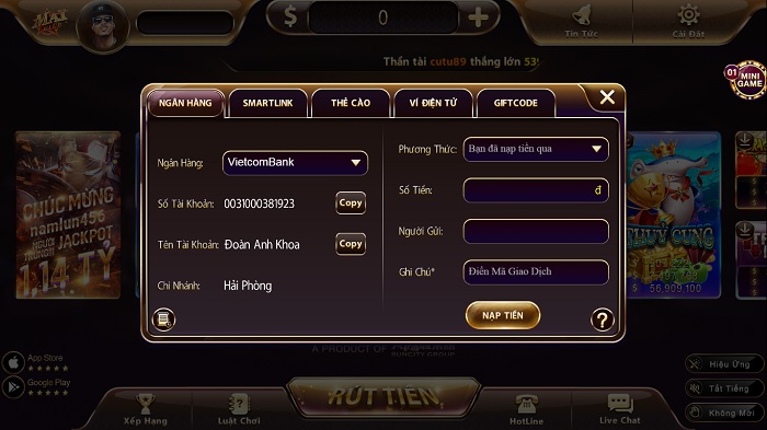 Đăng nhập tài khoản mà mình muốn nạp tiền. Chọn lựa ngân hàng muốn thực hiện giao dịch, hiện nay game bài đổi thưởng may club cung cấp các lựa chọn Vietcombank, ACB, BIDV, DongA, Sacombank, Techcombank, Vietinbank. Hệ thống cung cấp đầy đủ Số tài khoản/Tên tài khoản/Chi nhánh để chúng ta thực hiện giao dịch.