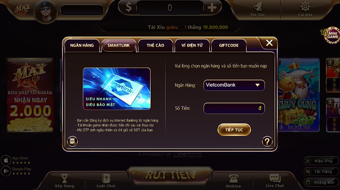 Hình thức này hệ thống của game đánh bài online may club cũng cung cấp các ngân hàng như Vietcombank, ACB, BIDV, DongA, Sacombank, Techcombank, Vietinbank, sau khi tìm được ngân hàng ưng ý thì chúng ta điền số tiền mà mình muốn nạp vào tài khoản là hoàn tất.