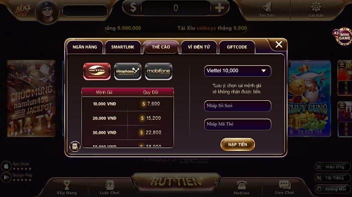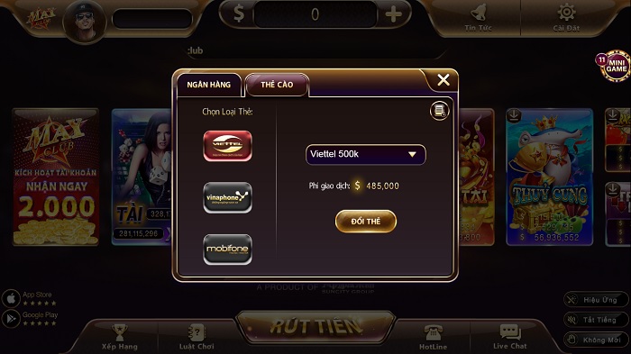 Khi chuyển đổi sang tab Ngân hàng, không khó để thấy rằng game bài đổi thưởng may club rất chỉnh chu trong khâu thiết kế bố cục. Khách hàng dễ dàng chọn lựa 1 trong 3 nhà mạng lớn của nước ta, sau đó chọn mệnh giá là xong. Tỷ lệ giữa các nhà mạng không chênh lệch là bao, ví dụ đổi 50.000 sẽ nhận được 48.500. Lựa chọn hoàn tất và nhấn Đổi thẻ, hệ thống sẽ gửi mã thẻ vào về Số điện thoại hoặc trực tiếp ngay trên màn hình giao dịch.