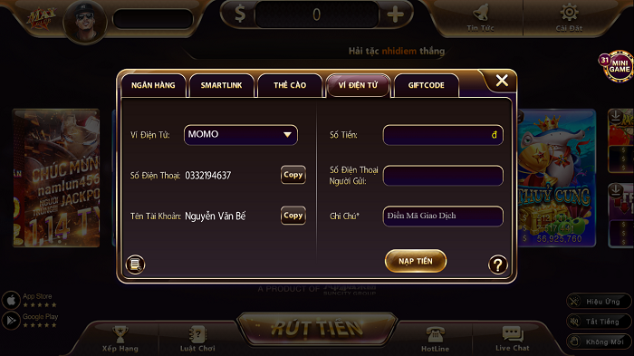 Hiện tại, may club chỉ cung cấp nạp tiền thông qua ví Momo, chúng ta chỉ cần lấy thông tin từ nhà cái như Số điện thoại, Tên tài khoản. Sau đó điền đầy đủ thông tin như Số tiền, Số điện thoại người thực hiện giao dịch, Ghi chú (điền mã giao dịch), thế là xong.