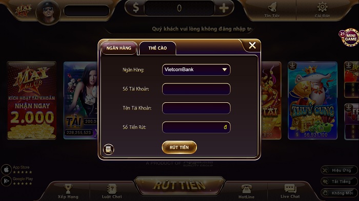 Ngay giao diện chính của may club, chúng ta chọn tính năng Rút tiền sau đó chọn tab Ngân hàng. Tại đây hệ thống cũng cung cấp các lựa chọn là Vietcombank, ACB, BIDV, DongA, Sacombank, Techcombank, Vietinbank. Sau đó điền đầy đủ các thông tin cần thiết như Số tài khoản, Tên tài khoản, Số tiền rút, khi đã hoàn tất nhớ nhấn thêm vào nút Rút tiền để hoàn tất thao tác.
