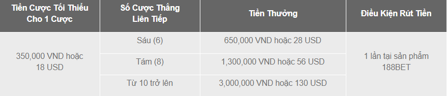 Để tham gia cá khuyến mãi, người chơi cần cược tối thiểu 350.00VND hoặc 18USD, nếu thắng liên tiếp 10 ván trở lên người chơi sẽ được nhận 3 Triệu VND hoặc 130USD tại nhà cái 188BET nhé.