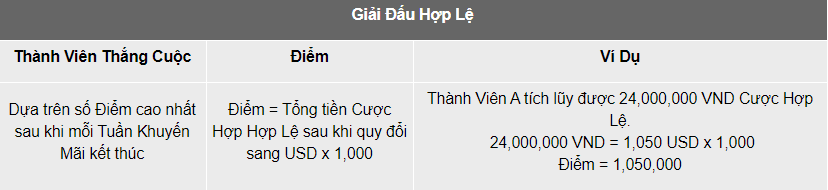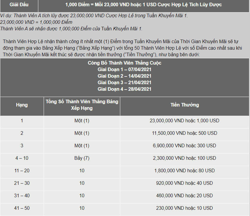 Mỗi người chơi sẽ có hệ số tích lũy điểm cao nhất sau mỗi tuần khuyến mãi kết thúc, điểm số cược sẽ được quy đổi sang USD x 1.000: