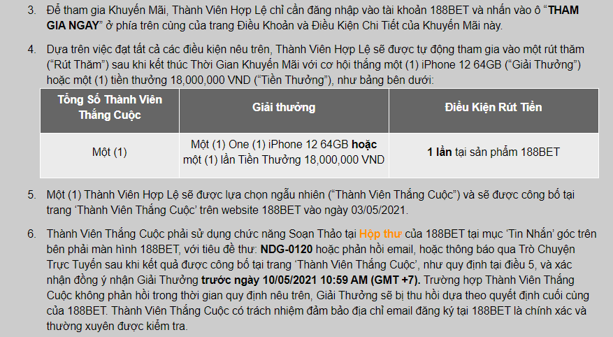 Với chính sách ưu đãi từ nhà cái 188BET đưa ra, phần nào đó giúp người chơi có thêm những phần quà giá trị khi đang tham gia cá cược tại nhà cái. Để nhận được phần quà giá trị là 1 chiếc Iphone 12 64Gb người chơi chỉ cần tham gia gửi tiền tại nhà cái và may mắn tham gia RÚT THĂM để có cơ hội thắng lới với chiếc Iphone 12 trên tay nhé.