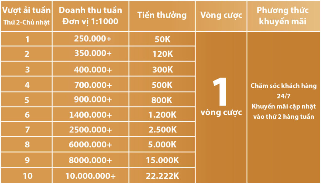 Khuyến mãi này chỉ áp dụng cho game bắn cá. Mỗi tuần nếu nếu thành viên có doanh thu cược hợp lệ sẽ được nhận thưởng, mức thưởng cao nhất lên đến 22.000.000 VNĐ