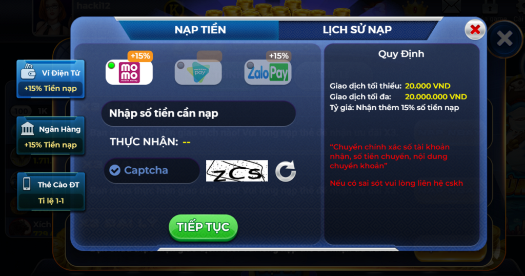 VD: Người chơi A nạp vào tài khoản 100.000 VND bằng hình thức giao dịch qua ví điện tử Momo và nhận được khuyến mãi 15% giá trị nạp.