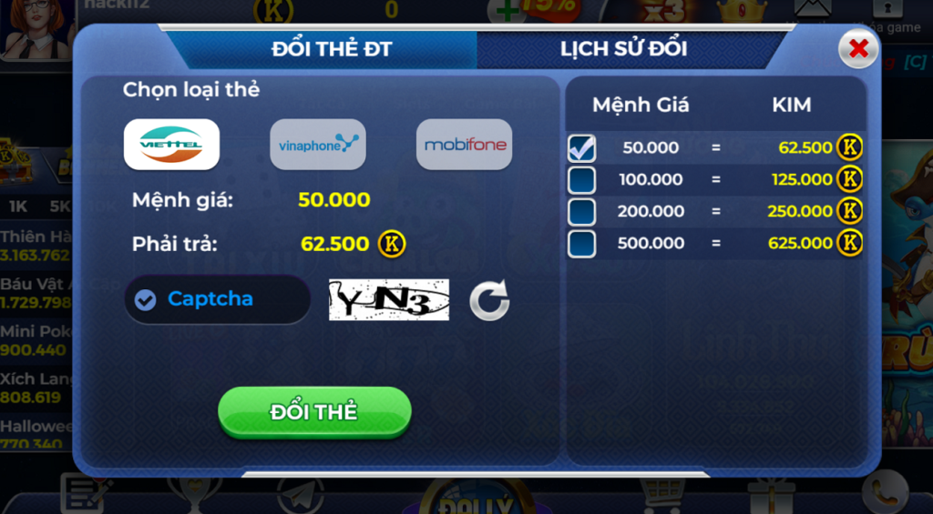 Tiền Nạp: 100.000 VND thẻ cào nhà mạng Viettel = 100.000 Kim