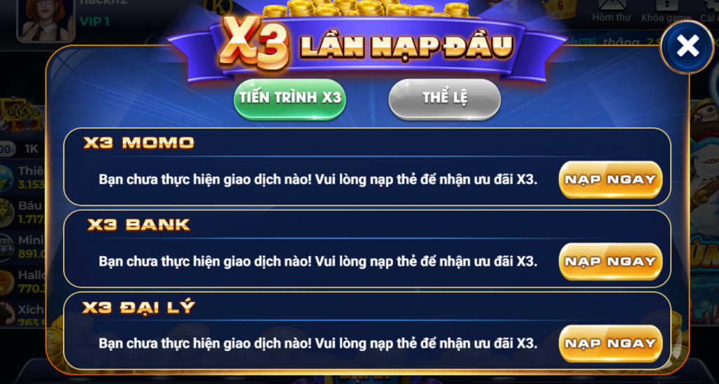 Khuyến mãi nhận X3 khi nạp lần đầu cho tất cả các thành viên Tân Thủ mới đăng ký, áp dụng cho nạp đại lý, nạp momo, nạp bank lần đầu tiên. Thưởng X3 lần đầu tiên, khuyến mãi 200% khi lần nạp đầu tiên với mọi hình thức nạp, tối đa 5.000.000 Kim/loại hình thức nạp.