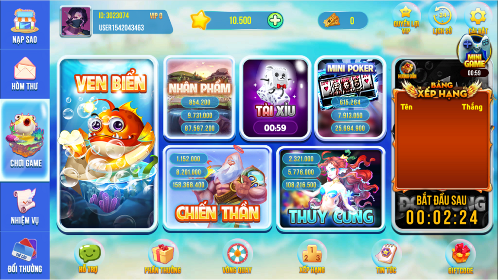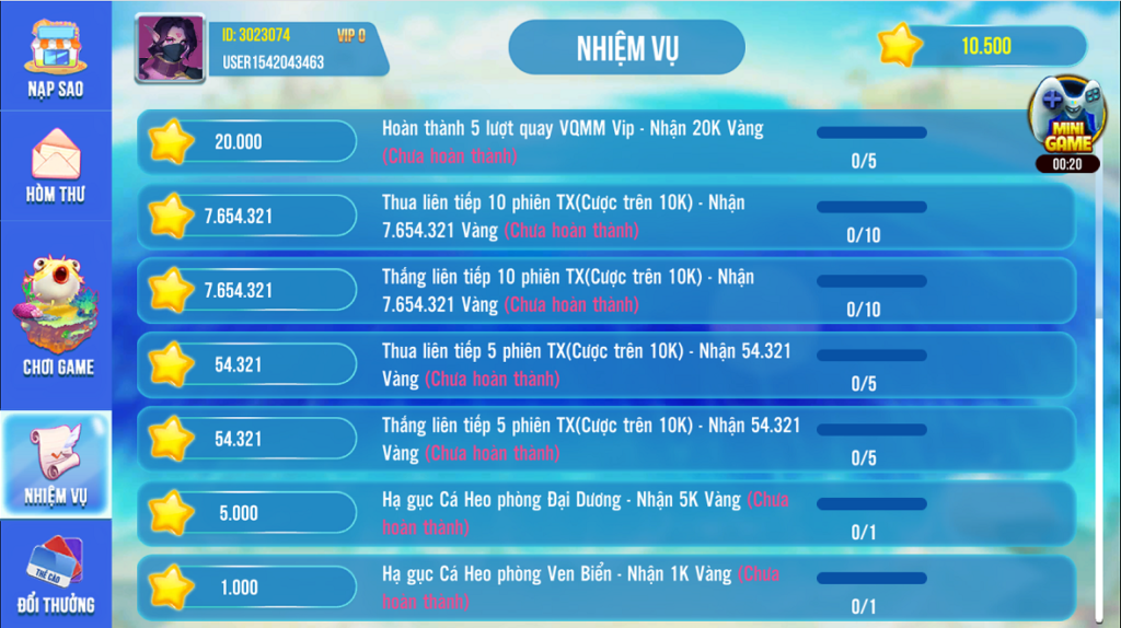 Người chơi có cơ hội kiếm thêm 16.000.000 sao mỗi ngày nhờ vào việc hoàn thành tất cả các nhiệm vụ được cổng game giao, các bạn hãy thể hiện mình thật tài giỏi bằng cách hoàn thành thật xuất sắc các nhiệm vụ được giao và lãnh thưởng nha.
