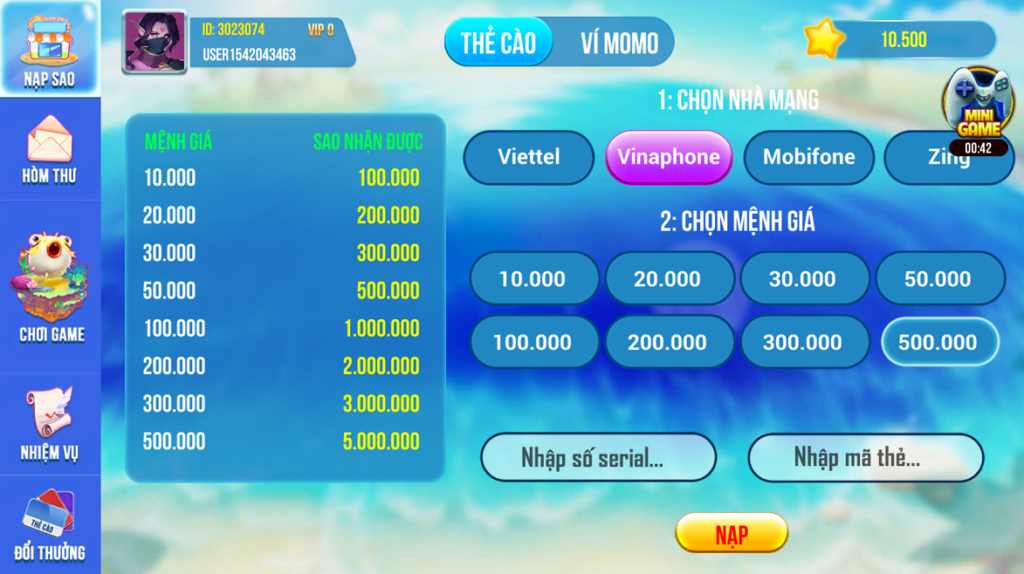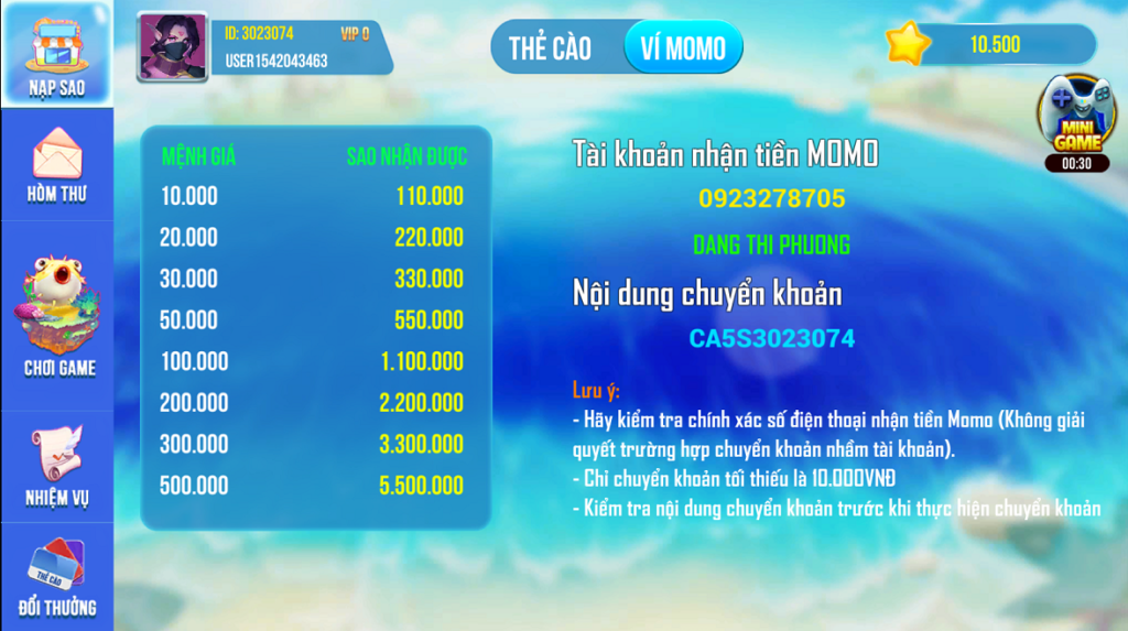 VD: Nếu các bạn nạp 500.000 VND thông qua Ví Momo, các bạn sẽ dược nhận 5.500.000 sao thay vì 5.000.000 sao như cách thức nạp thẻ cào thông thường nha.