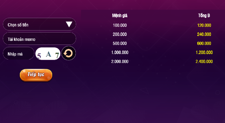 VD: Người chơi A nạp 100.000 VND vào tài khoản qua hình thức giao dịch ví Momo sẽ nhận được thêm 20.000 VND (khuyến mãi 20%). Tổng tiền người chơi A có trong tài khoản là 120.000 VND.