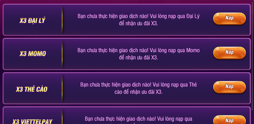 Người chơi Tân Thủ khi tiến hành đạt các mốc sau nhận thêm 200% thưởng. Giá trị lên đến 10.000.000. Áp dụng cho tất cả các hình thức nạp thẻ, nạp Momo, nạp viettel pay, nạp đại lý lần đầu.