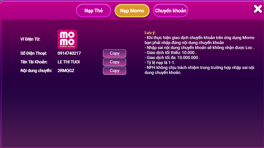 Để giải quyết vấn đề người chơi phải chờ đợi hàng chờ khi hệ thống quá tải trong lúc giao dịch nạp tiền bằng thẻ cào. Cổng game Lộc 79 đã cho ra tính năng thanh toán giao dịch nạp rút tiền thông qua ví điện tử Momo để giúp người chơi thực hiện giao dịch một cách nhanh chóng nhất. Để mừng và khuyến khích người chơi giao dịch qua ví điện tử Momo, cổng game bài Lộc 79 đưa ra khuyến mãi thưởng 130% giá trị tiền nạp khi thanh toán nạp tiền bằng hình thức ví điện điện tử. Để rõ hơn về ưu đãi này, theo dõi bên dưới cùng gametoping nha.