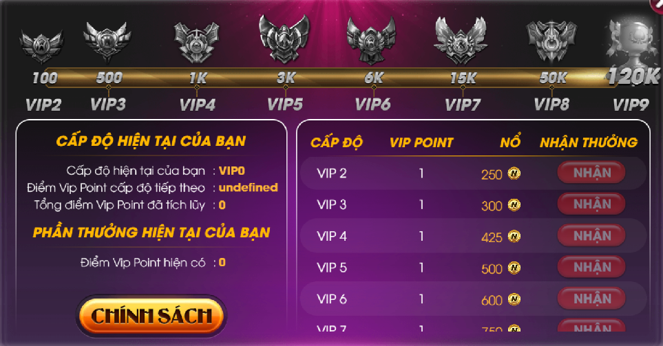 Cơ hội nhận 120k khi người chơi sở hữu VIP 9 và 1050 N tại cổng game Nổ Hũ Club gửi tặng đến những người chơi Đẳng Cấp tại cổng game.Các bạn nên nhớ, điểm VIP càng cao đổi quà càng lớn nhận quà càng to từ cổng game nhé.