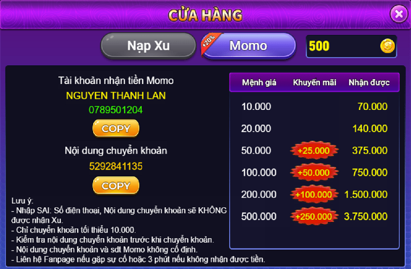 - Nhập SAI số điện thoại, nội dung chuyển khoản sẽ KHÔNG nhận được xu