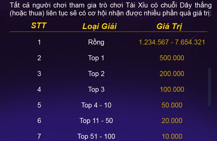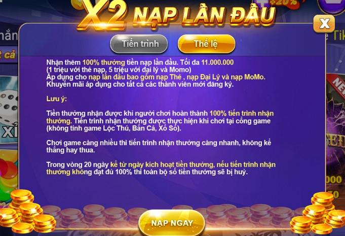 - Tiền thưởng nhận được người chơi hoàn thành 100% tiến trình nhận thưởng. Tiến trình nhận thưởng được thực hiện khi chơi tại cổng game (không tính game Lộc Thú, Bắn Cá, Xổ Số)