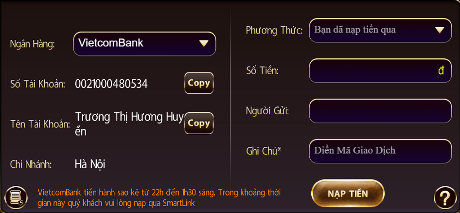 Sau khi hệ thống kiểm trả sẽ tiền sẽ tự động cập nhật vào tài khoản của người chơi đã đăng kí tại hệ thống cổng game nha. Người chơi vui lòng chờ đợi 5-10p để hệ thống kiểm tra và sẽ thực hiện thành công giao dịch nha.