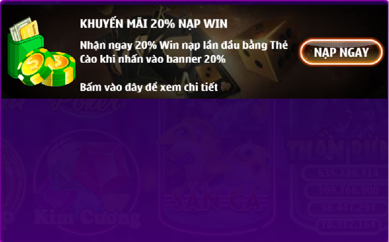 Người chơi nạp Win lần đầu tiên bằng hình thức Thẻ Cào khi nhấn vào Banner sự kiện sẽ nhận thêm được 20% trên tổng mức Win nạp vào cổng game. Nếu không click vào Banner mà vào cửa hàng để nạp trực tiếp thì sẽ không nhận được khuyến mãi.