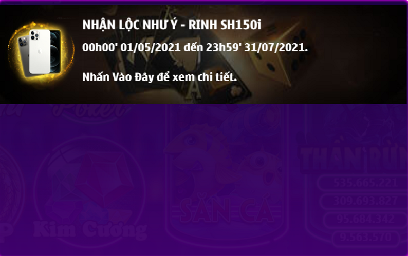 Để tri ân những người chơi đã đồng hành cùng cổng game Vin79, nhà phát hành quyết định ra mắt sự kiện Nhận Lộc Như Ý – Rinh SH150i. Với sự kiện lần này, mỗi khi nạp tích lũy đạt mốc người chơi sẽ được số lần Nhận Lộc Như Ý.