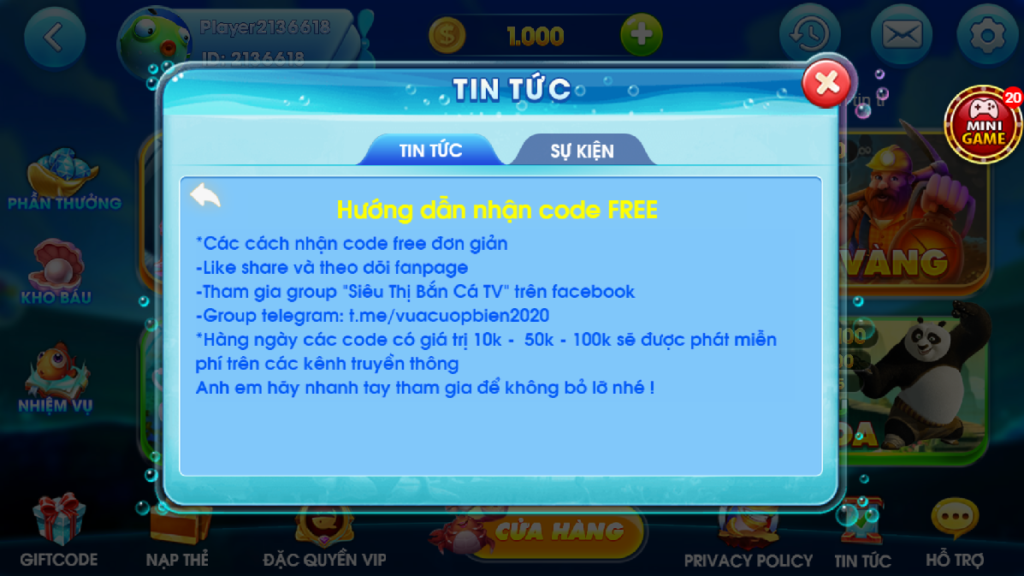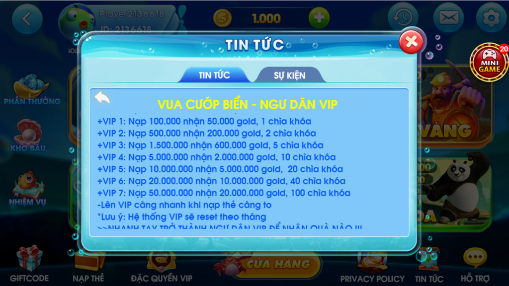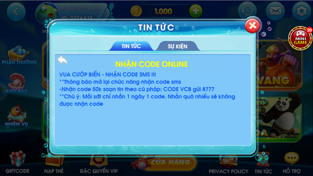 Những người chơi Tân Thủ khi trải nghiệm tại cổng game bắn cá đổi thưởng tại Vua Cướp Biển sẽ bao giờ sợ trắng tay lập nghiệp đâu nha. Vua Cướp Biển liên tục khuyến mãi, ưu đãi các Giftcode miễn phí cho người chơi hằng ngày với những cách nhận Giftcode vô cùng đơn giản như sau: