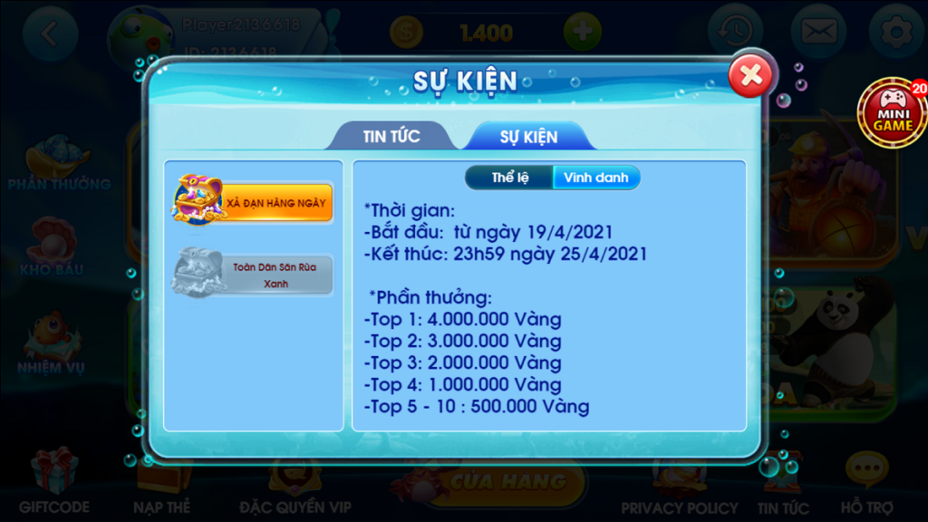Nhanh tay tham gia sự kiện Săn Rùa Xanh để có cơ hội nhận ngay 4 Triệu Vàng từ hệ thống game bắn cá đổi thưởng Vua Cướp Biển nha mọi người. Thời gian diễn ra sự kiện bắt đầu từ ngày 19/4/2021 đến hết 23h59p ngày 25/4/2021 nha, nhanh tay đăng ký tham gia Săn Rùa Xanh nào mọi người ơi.