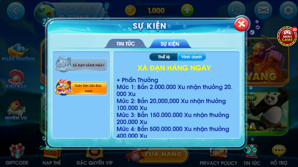 Thể lệ tham gia cực kỳ đơn giản: Trong thời gian sự kiện diễn ra, Ngư Dân nào săn được nhiều Rùa Xanh hơn thì sẽ được nhận quà. Số điểm được tính theo số điểm mà người chơi bắn chết Rùa Xanh, ngươi chơi top 1 có cơ hội nhận đến 4 Triệu Vàng trong sự kiện lần này.