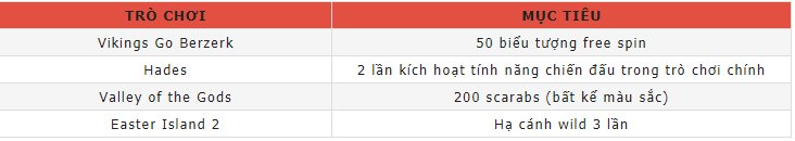 Phần 2: Thành viên phải đạt được hết tất cả các nhiệm vụ trong trò chơi tương ứng với từng trò chơi theo như bảng bên dưới