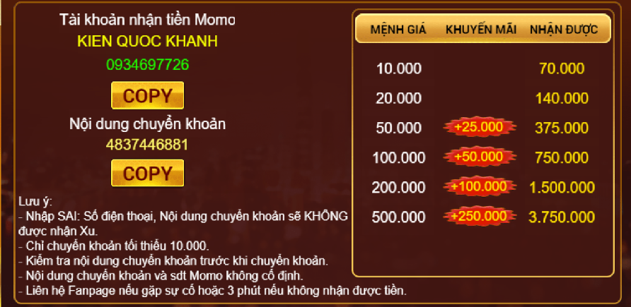 - Nhập sai số điện thoại, nội dung chuyển khoản sẽ KHÔNG được nhận Xu