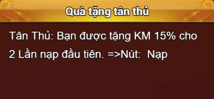 Là món quà cổng game Xu Vàng 777 tặng đến những người chơi tân thủ sau khi đăng ký tài khoản cá cược tại cổng game Xu Vàng 777. Áp dụng khuyến mãi cho lần nạp đầu tiên lên đến 15% giá trị nạp tiền vào tài khoản cổng game. Ngoài ra người chơi còn nhận được 3.000 vàng để khởi nghiệp sau khi đăng ký thành công tài khoản nha.