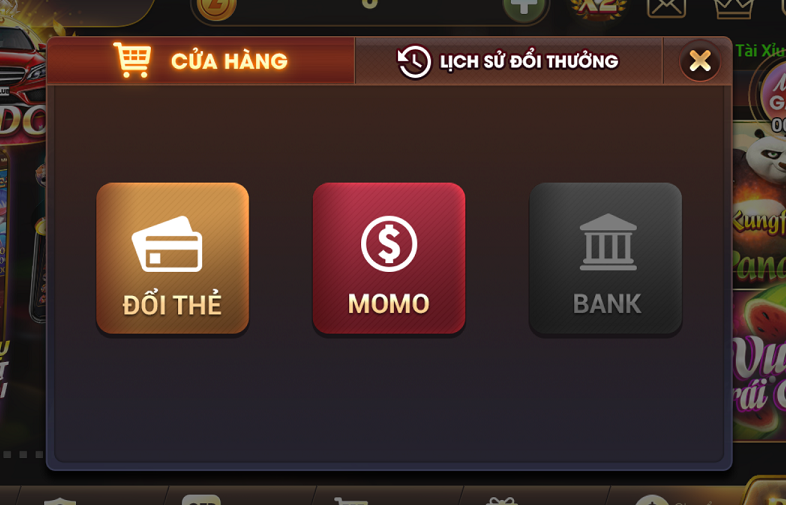 Ở mục CỬA HÀNG trên giao diện, người chơi nhấn chọn vào mục “cửa hàng” lựa chọn đổi sang Thẻ Cào hoặc Momo để tiếp tục thực hiện giao dịch nha.