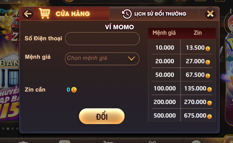 100.000 VND tương đương với 120.000 Zin nhé. Người chơi lựa chọn Thẻ Cào hoặc số tiền muốn giao dịch sang Momo nhấn ĐỔI ngay lập tức hệ thống sẽ tự động trừ Zin sẽ gởi quà tặng đến từng tài khoản nha.