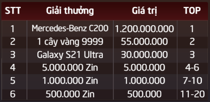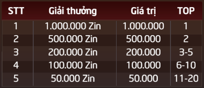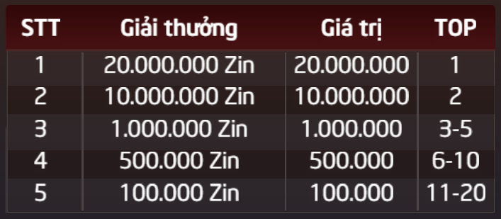 - Sau khi kết thúc 28 ngày sự kiện. TOP 20 người chơi có số điểm cao nhất kể từ khi bắt đầu sự kiện sẽ được nhận thưởng tương ứng sau đây