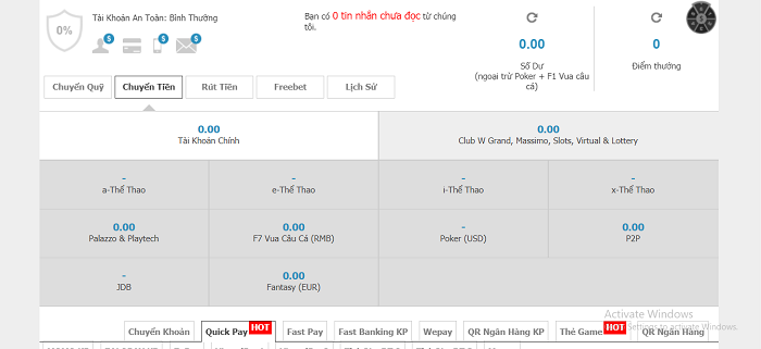 Các ví trò chơi tại W88. Ở đây mỗi trò sẽ có 1 tài khoản riêng