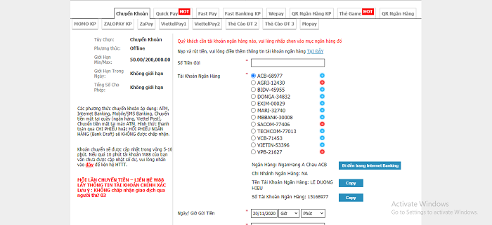 - Chuyển khoản Internet Banking với 15 ngân hàng tốt nhất tại Việt Nam: Vietcombank, Agribank, TPBank, Techcombank, Eximbank, Sacombank, BIDV, DongA Bank,…..